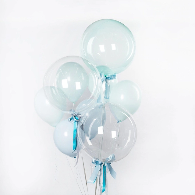 Состав: шар латексный-6 шт, шар «Мыльный пузырь»-3 шт, лента атласная.