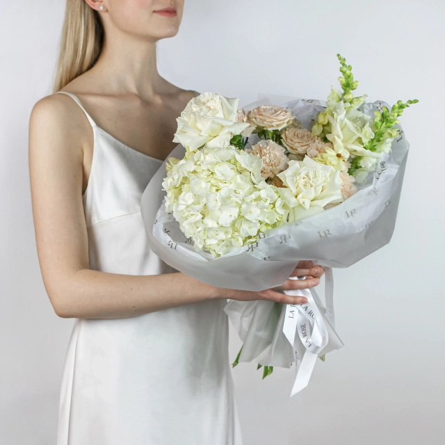 Состав: белая гортензия, пионовидная роза сорта Playa Blanka, львинный зев, гвоздика