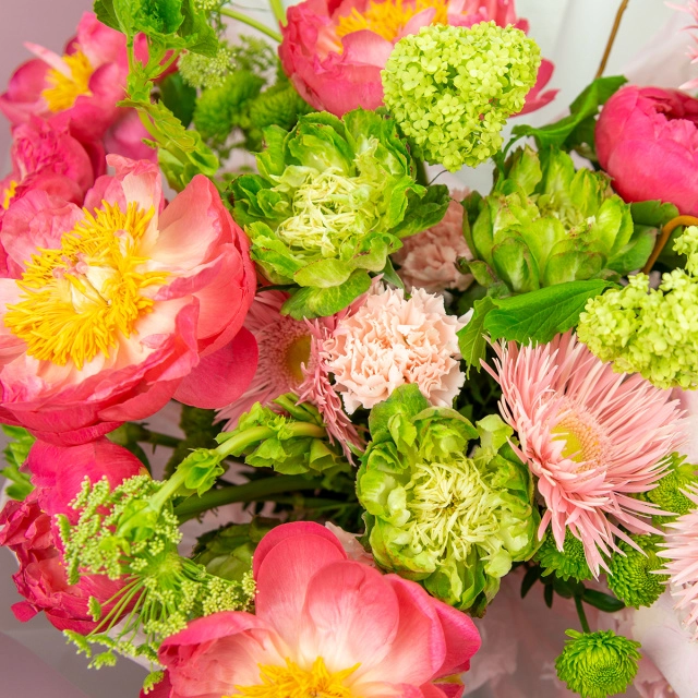 Пион, гвоздика, гортензия, роза, гербера, вибурнум, молюцелла, амми, упаковка
