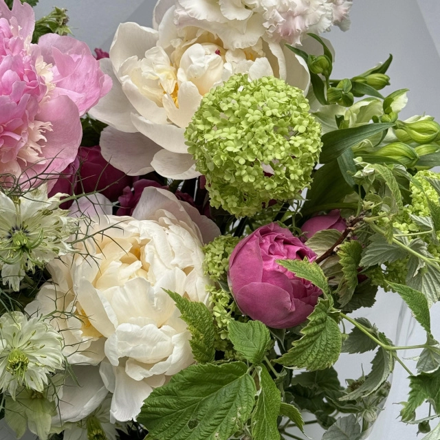 Пионы, Вибурнум, Эустома, Листья малины, Нигелла, Кустовая роза, Альстромерия, Упаковка, Лента