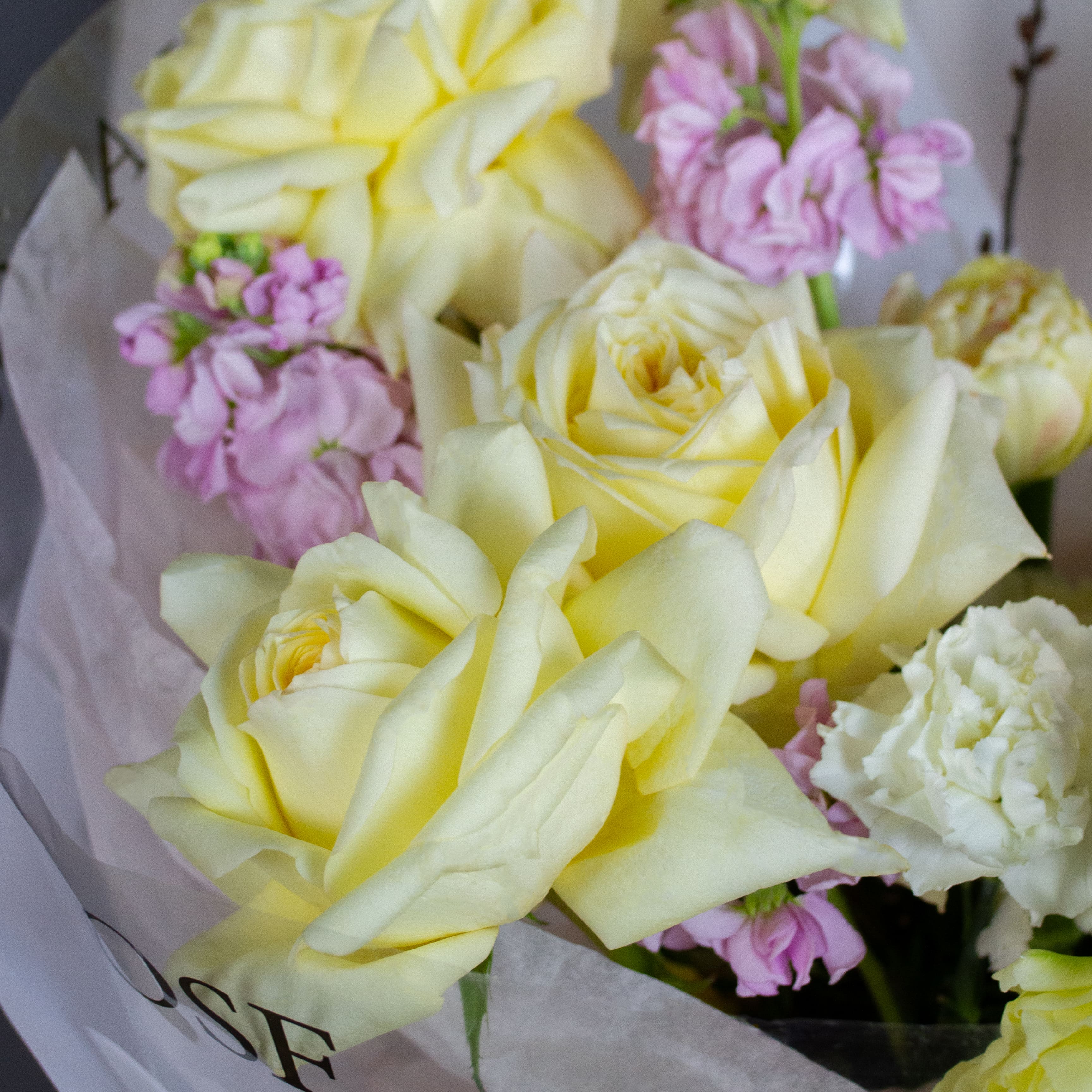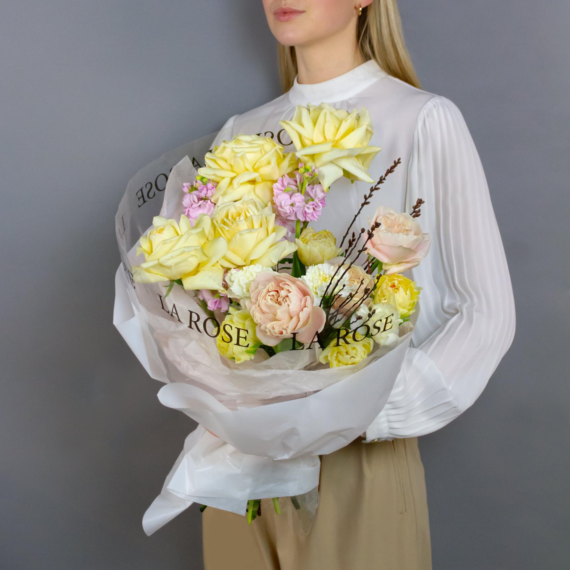 Размер S: Гвоздика (5 шт), Роза Пионовидная Шифон (2 шт), Роза Пионовидная Candlelight (3 шт), Тюльпан белый пионовидный (3 шт), Левкой (2 шт) Краснодар Pink (2 шт), Мирика Gagel (1 шт), декоративная упаковка