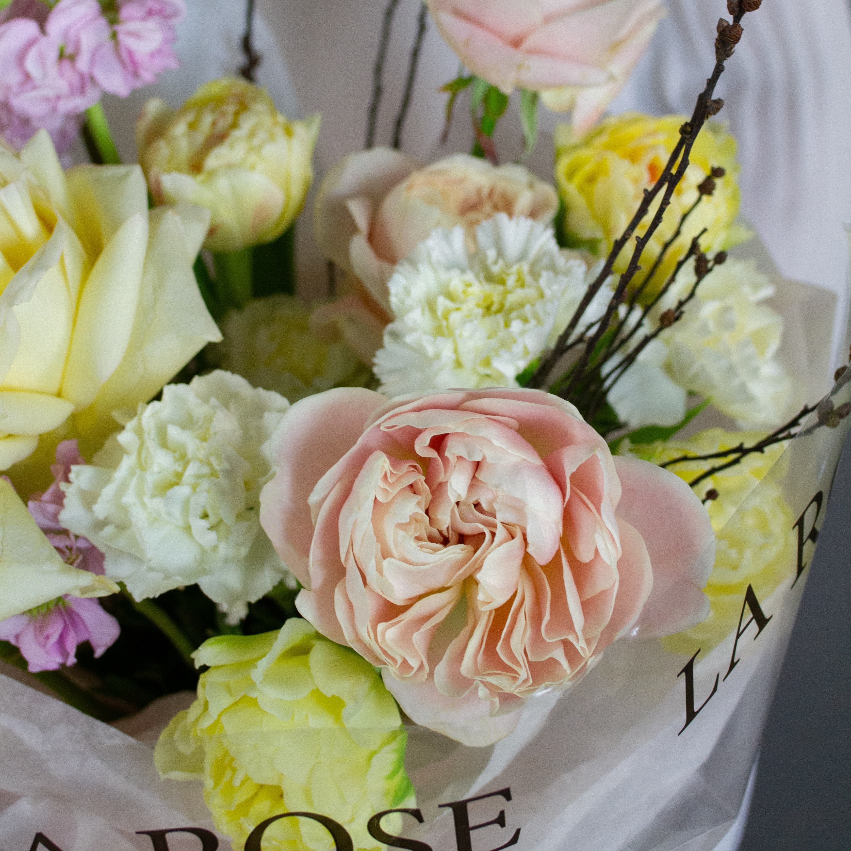 Размер L:  Гвоздика (6 шт), Роза Пионовидная Шифон (4 шт), Роза Пионовидная Candlelight (5 шт), Тюльпан белый пионовидный (6 шт), Левкой (5 шт) Краснодар Pink (5 шт), Мирика Gagel (2 шт), декоративная упаковка
