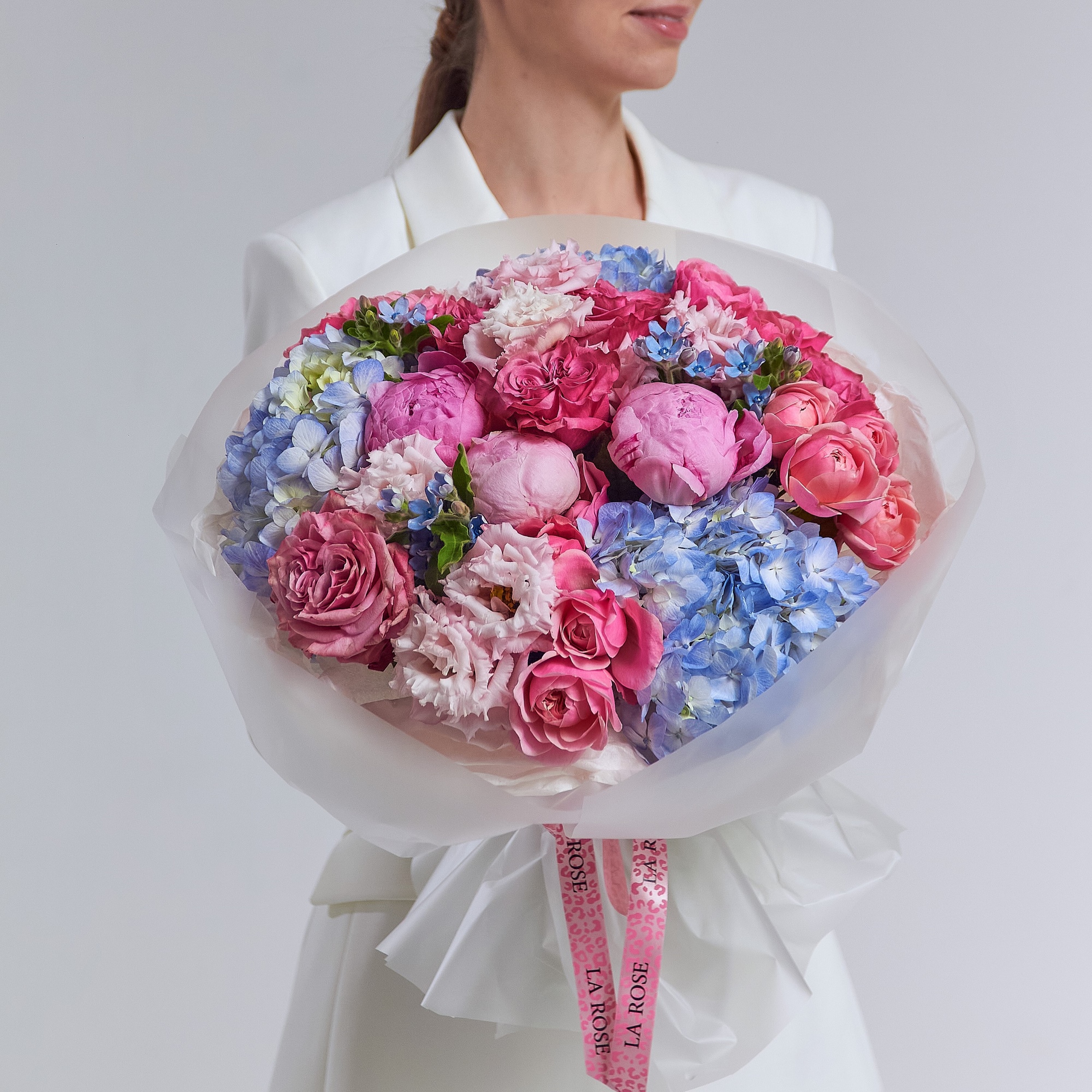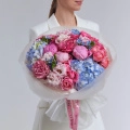 Состав: Пион Sarah Bernhardt, Оксипеталум Tan Pur Blu, Фисташка, Эустома G Alissa Pink, Роза кустовая Сильва Пинк, Роза Эквадор Кантри Блюз, Гортензия Колумбия