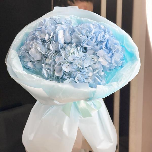 Изысканная монокомпозиция из нежных голубых гортензий — воплощение элегантности и утонченного вкуса. Этот букет создан для тех, кто ценит благородную сдержанность и природную красоту.