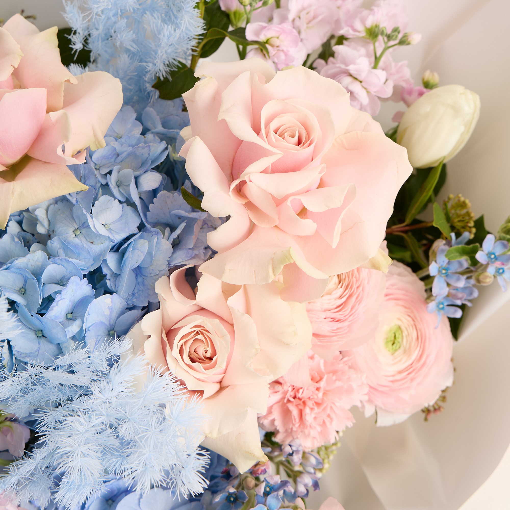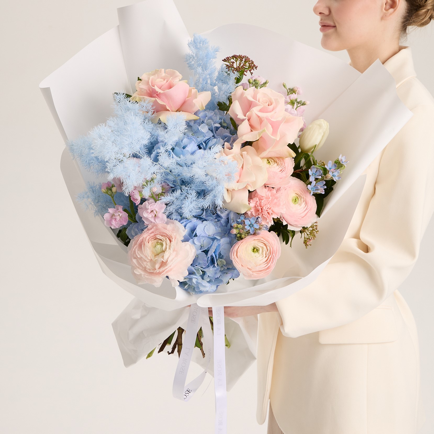 Букет в голубых тонах с розовыми розами