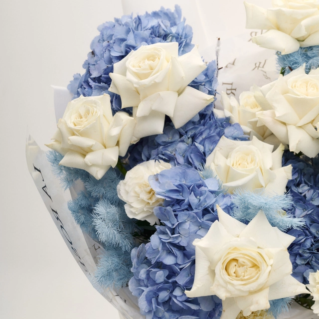Букет в голубых оттенках с гортензией и аспарагусом
