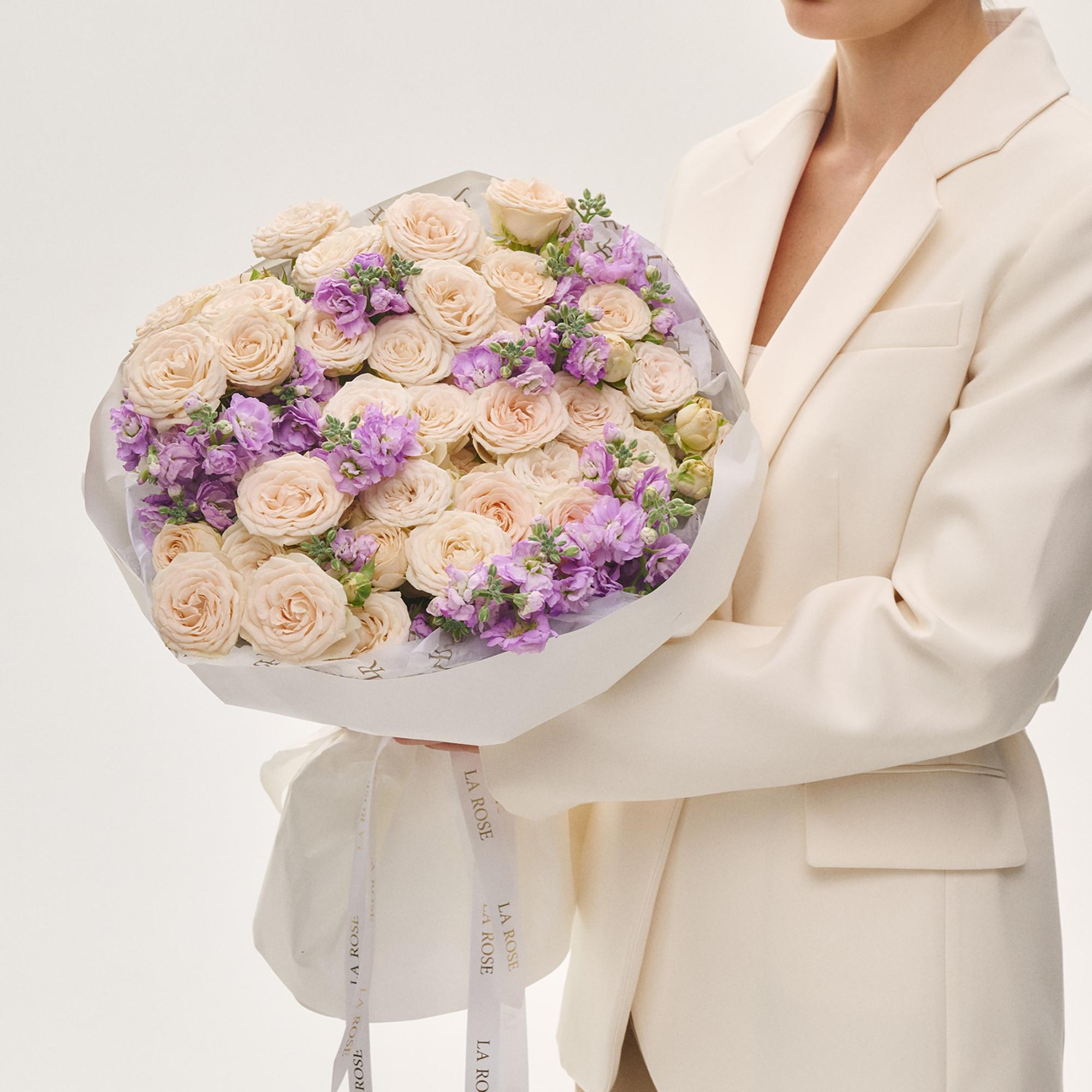 Элегантная флористическая композиция, сочетающая благородство кустовых роз Sophie с романтичным очарованием левкои. Этот дуобукет создан для тех, кто ценит изысканность и естественную красоту.