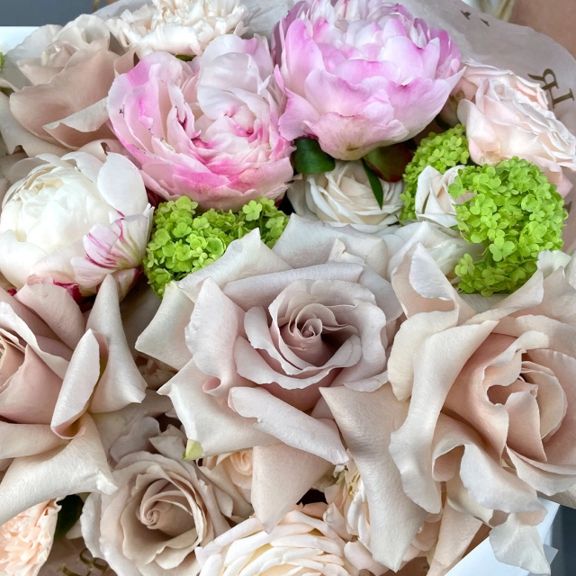 пион, роза кустовая пионовидная, вибурнум, гвоздика, роза